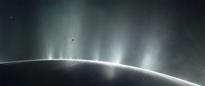 Enceladus is a water ice-covered moon of Saturn famous for geyser-like plume eruptions at its south pole.